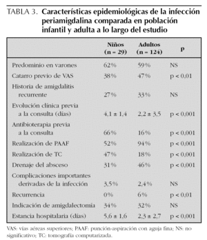 En estos 6 años de estudio, los 29 niños diagnosticados de IPA supusieron el 18,9 % de todos los casos en nuestro centro, ya que resultaron igualmente atendidos 124 adultos por flemón o APA. Con respecto a los 5 años anteriores a la revisión efectuada, sólo habían sido detectados 5 niños con flemón o APA, y aunque el volumen en la población adulta también había resultado más escaso, 79, el porcentaje de afectación infantil alcanzó sólo el 8,1 %. La figura 1 muestra la incidencia de casos de IPA en los últimos 11 años, diferenciando población infantil y adulta. Este crecimiento resultó estadísticamente significativo (p < 0,001). Así mismo, en la tabla 3 se evidencian las diferencias epidemiológicas entre la población infantil y adulta que en estos 6 años padecieron infección amigdalar.
