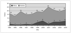 Figura 1. Incidencia de casos registrados entre niños y adultos con infección periamigdalina en los últimos 11 años.