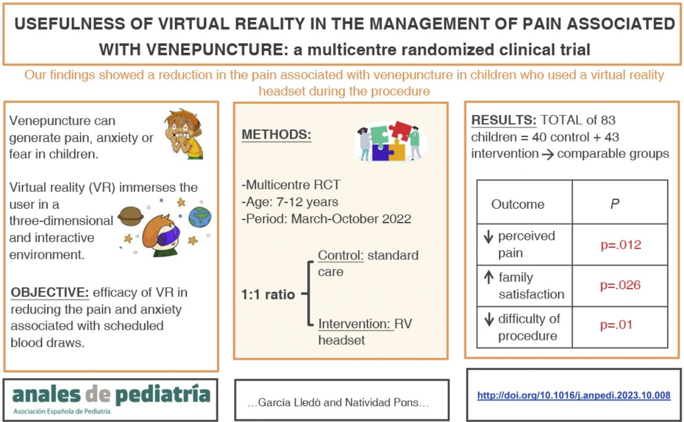 In conclusion, the use of VR headsets during venepuncture achieved a reduction in the pain and anxiety reported by children, although the difference in anxiety was not statistically significant. Families reported greater satisfaction with the use of VR headsets, and nurses decreased difficulty in performing the procedure. Therefore, based on our experience, it is reasonable to conclude that the use of VR headsets is beneficial for the patient, the family and the health care staff.