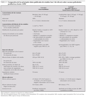 En el momento actual 2 vacunas polivalentes frente a VPH están siendo objeto de estudios fase III y estarán pronto disponibles en nuestro medio: la vacuna bivalente (Cervarix®, GlaxoSmithKline) y la vacuna tetravalente (Gardasil®, Sanofi Pasteur MSD) (tabla 1). Ambas vacunas son seguras, bien toleradas, y protegen con una eficacia del 100 % frente a la infección persistente por los VPH 16 y 18, un paso biológico intermedio clave en la carcinogénesis cervical 36-39. Su eficacia frente a la neoplasia cervical intraepitelial grado 2 o superior producida por los VPH 16 y 18, precursores del cáncer cervical, es también del 100 % en función de los datos ya difundidos y a la espera de la publicación los resultados definitivos de los estudios fase III en marcha; en el caso de la cuadrivalente, el grado de eficacia es igualmente elevado en la protección frente a las verrugas genitales por VPH 6 y 11 36-39,44-50. Sabemos además que la vacuna es eficaz al menos durante 4,5 años y 3 años, respectivamente, para la vacuna bivalente 39 y la cuadrivalente 37,45. Desde junio de 2006, la vacuna cuadrivalente ha sido licenciada por la Food and Drug Administration (FDA) 47 y recomendada desde ese mismo mes por el Advisory Committee on Immunization Practice (ACIP) del Center for Disease Control and Prevention (CDC) de Estados Unidos 48.