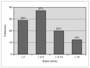 La cobertura vacunal según la edad mostró diferencias estadísticamente significativas: la media de edad en los no vacunados fue de 7,6 ± 5,3 años y en los vacunados de 5,5 ± 4,6 años (p = 0,011). En los niños menores de 2 años la cobertura alcanzada fue del 27,5 %, en los de 2 a 5 años del 36,7 %, en los de entre 5 y 10 años del 20 % y en los mayores de esta edad del 13,4 % (p = 0,027) (fig. 2).