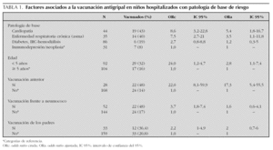 En el análisis multivariable, se observó que las variables cardiopatía (OR: 5,4; IC 95 %: 1,8-16,7), enfermedad respiratoria crónica (OR: 3,5; IC 95 %: 1,1-11,8), vacunación en la temporada anterior (OR: 17,3; IC 95 %: 5,4-55,5) y edad menor de 5 años (OR: 2,8; IC 95 %: 1,1-7,4) eran predictoras independientes de vacunación antigripal en estos pacientes (tabla 1).