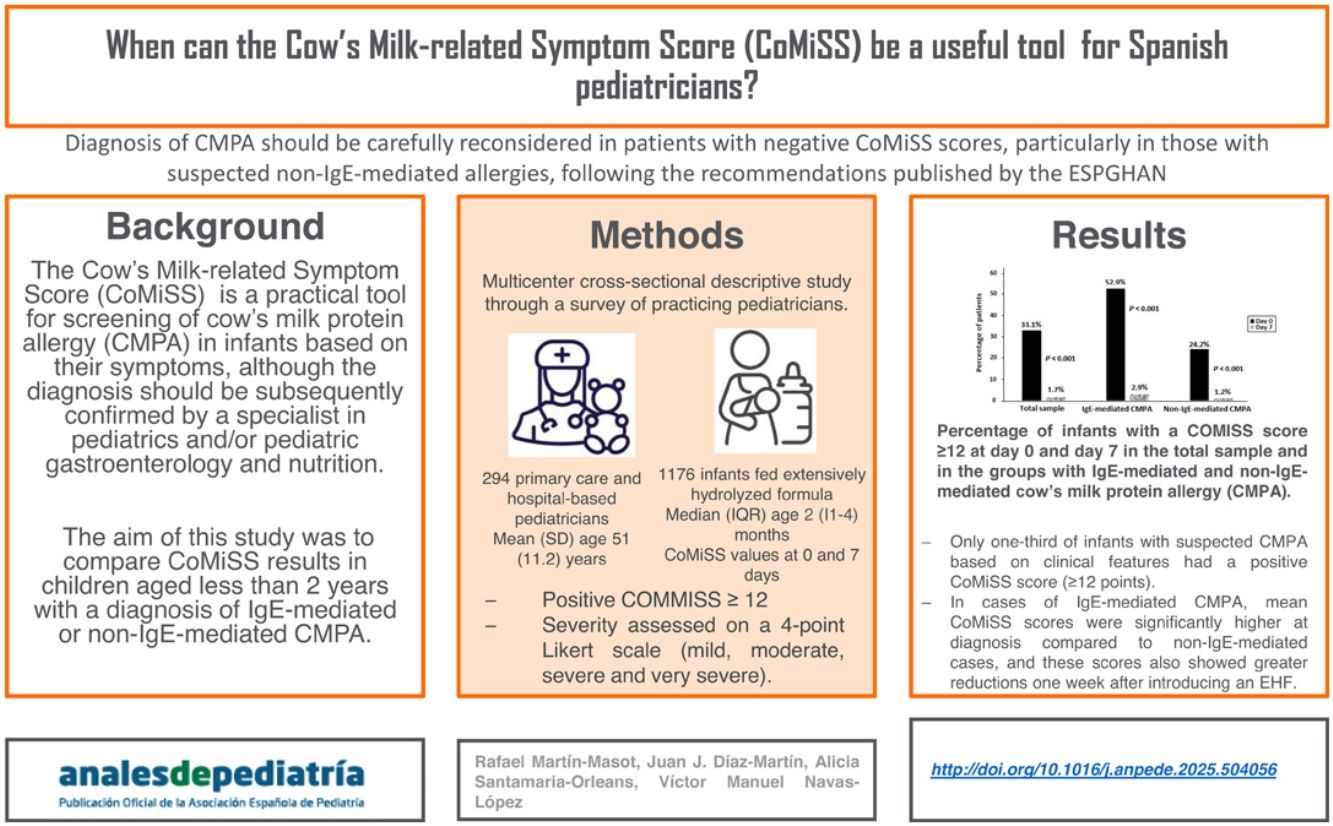 Material and methodsMulticenter, cross-sectional survey study with participation of pediatricians throughout Spain. Pediatricians were directed to apply the CoMiSS to infants at the time of diagnosis of CMPA and 7 days after initiating nutritional management with an extensively hydrolyzed formula (EHF). We interpreted a CoMiSS score of 12 or greater as positive.