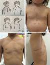 Actualmente, nuestra casuística recoge cardiopatías abordables a través de la aurícula derecha (e izquierda ocasionalmente, como patología mitral y cor triatriatum) y alberga casos de complejidad creciente desde CIA OS hasta canal AV completo. Debido a la indicación cada vez más precoz en la corrección de algunas cardiopatías, la versatilidad en los abordajes nos permite seleccionar el más adecuado en cada caso. Los diferentes accesos presentados no son excluyentes entre sí; pueden ofrecerse distintas alternativas en función del tipo de cardiopatía o peso del paciente. Así, tal como se refleja en la tabla 2, una CIV en un niño menor de 10 kg es cerrada a través de miniesternotomía; una CIA ostium secundum o CIA tipo seno venoso por vía axilar si pesa 16 kg, optando por un abordaje submamario si se trata de una niña mayor con mamas desarrolladas (fig. 5). El abordaje diferencial en función del sexo28 ya no es una premisa; tanto niños como niñas pueden beneficiarse de accesos miniinvasivos hoy en día.