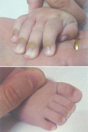 Nuestro caso es una niña de 2 meses de edad que presentaba hiperpigmentación distal del dorso de falanges de manos y pies, que se descubrieron casualmente poco después del nacimiento y que empezaron a ser motivo de preocupación para los padres dada la tendencia a intensificarse y a progresar proximalmente. El embarazo transcurrió sin incidencias; se había practicado una amniocentesis, por la edad de la madre, de la que resultó un cariotipo fetal 46XX. Nacida de padres no consanguíneos y sin enfermedad relevante a la 41 semanas de gestación, por vía vaginal y de forma eutócica; peso y longitud acordes para edad gestacional. El período neonatal transcurrió sin sucesos de interés. Las pruebas metabólicas (incluida hiperplasia suprarrenal) resultaron normales. En la actualidad, la lactancia artificial y el seguimiento pediátrico son satisfactorios. No existen antecedentes familiares de dermatosis ni de otro tipo de enfermedad relevante.