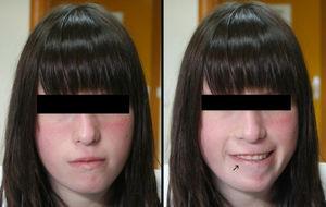Pacientes y métodosAdolescente de 16 años de edad, con diabetes mellitus tipo 1, a la que durante una revisión rutinaria de hemoglobina glicosilada se le detecta una facies asimétrica con la sonrisa (Figura 1). Antecedentes personales: embarazo controlado. Parto por cesárea a la 38 semana con peso, longitud y perímetro en p10-25; se detectan mielomeningocele lumbosacro y ureterohidronefrosis izquierda de grado II con riñón izquierdo hipoplásico sin disfunción. Posteriormente se diagnostican: dificultades iniciales para la succión, debut de diabetes mellitus tipo 1 a los 4 años de edad (anticuerpos anti GAD65 e ICA positivos) y buen control metabólico posterior; dificultades de aprendizaje, estrabismo e hipotiroidismo subclínico no autoinmunitario (TSH 6-12μU/ml; VN: 0,4-5,5). Menarquia a los 12 años de edad. Talla < p3 (–2,3 DE) desde los 2 años de edad hasta 148,5cm (–2,6 DE) en la actualidad y considerada de adulto por una edad ósea de 18 años (Greulich & Pyle). Antecedentes familiares sin interés.