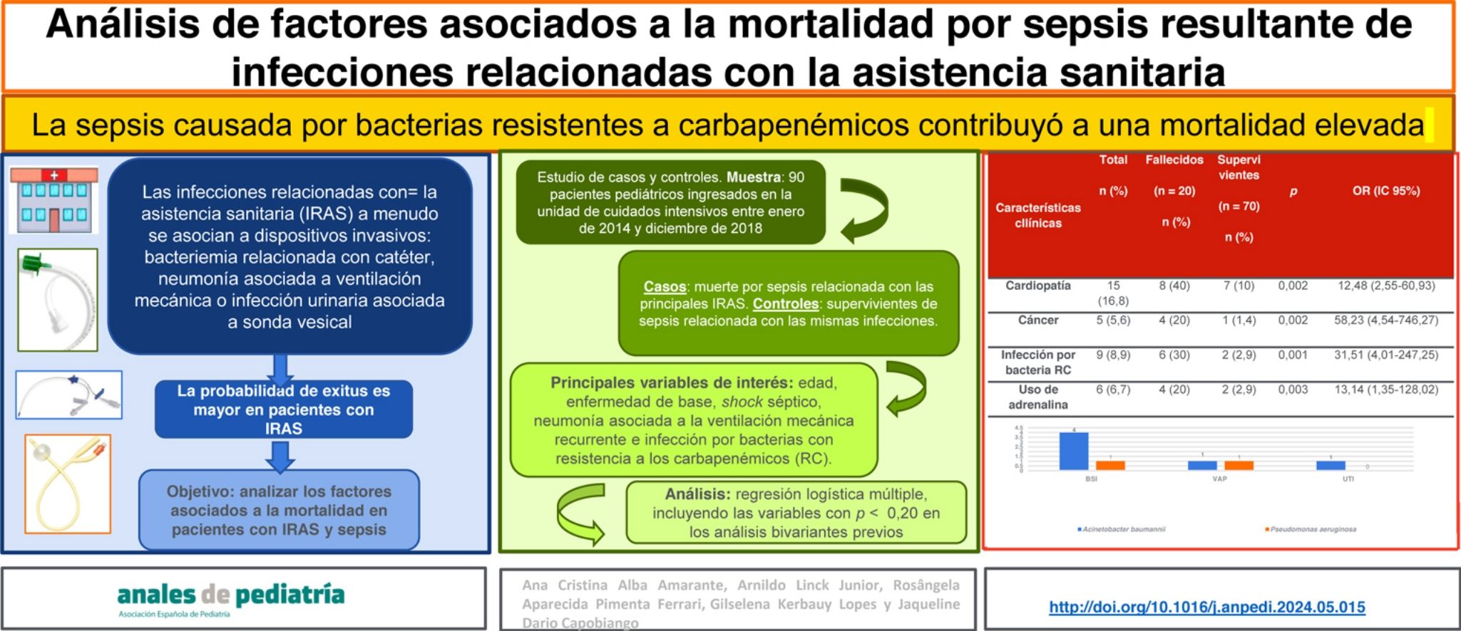 Las infecciones relacionadas con la asistencia sanitaria (IRAS) contribuyen a la morbimortalidad y a la diseminación de organismos multirresistentes. Los niños ingresados en la unidad de cuidados intensivos son sometidos a procedimientos invasivos que aumentan su riesgo de desarrollar IRAS y sepsis. El objetivo de este estudio fue analizar los factores asociados a la letalidad por sepsis derivada de IRAS.
