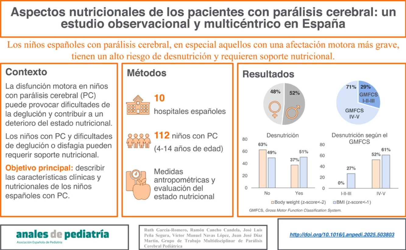 ConclusionesNuestro estudio muestra que los niños españoles con PC, especialmente aquellos con mayor deterioro motor grave, están en riesgo de desnutrición, presentan comorbilidades gastrointestinales y requieren apoyo nutricional.