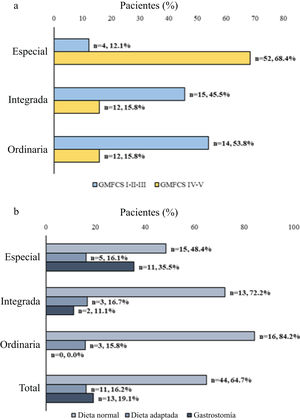 ResultadosSe incluyó un total de 112 pacientes con una edad media de 9,2 años. Un 70,5% presentaba un grado IV-V en el Sistema de Clasificación de la Función Motora Gruesa (GMFCS). En comparación con aquellos con GMFCS I-II-III, los niños con grados IV-V del GMFCS mostraron una puntuación z media significativamente menor en peso, talla, relación peso/talla, índice de masa corporal y circunferencia del brazo, y un área del brazo significativamente menor. Una proporción mayor de pacientes con GMFCS IV-V asistió a escuelas de educación especial en comparación con pacientes con GMFCS I-II-III (68,4% vs. 12,1%, p<0,0001). Una mayor proporción de niños con GMFCS IV-V presentó disfagia (62,0% vs. 15,2%, p<0,0001), estreñimiento (51,9% vs. 27,3%, p=0,0218) y reflujo gastroesofágico (31,6% vs. 3,0%, p=0,0005) en comparación con niños con GMFCS I-II-III.