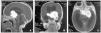 En un primer momento se cambia la lactancia artificial de inicio por un hidrolizado de proteínas de leche de vaca a la espera de los resultados de las pruebas complementarias sin que exista una mejoría clínica. Dentro de las exploraciones complementarias se realiza de forma escalonada: analítica sanguínea con parámetros nutricionales y estudio de inmunidad, serologías virales, analítica de orina, cribado de metabolopatías, ecografía abdominal, PRICK y RAST para proteínas de leche de vaca: todos ellos sin hallazgos de interés. Dentro del estudio sistemático se realiza una ecografía transfontanelar que evidencia tumoración quística hiperecoica de 45 mm en la región selar. La resonancia magnética craneal confirma una tumoración sólida supraselar situada a nivel del quiasma óptico que comprime hipotálamo y lóbulo frontal englobando los senos cavernosos (fig. 1). Ante la existencia de una tumoración diencefálica se solicita estudio de funcionalismo del eje hipotálamo-hipofisario que es normal. Tras analizar las posibilidades terapéuticas de forma multidisciplinar se decide realizar resección tumoral parcial a través de una craniectomía frontotemporal izquierda. Se remite a anatomía patológica la pieza quirúrgica siendo informada como astrocitoma fibrilar de grado bajo. Se inicia quimioterapia neoadyuvante con carboplatino y vincristina. A pesar del esfuerzo terapéutico la paciente presenta un empeoramiento progresivo. En los controles por neuroimagen se detecta una progresión tumoral y la aparición de metástasis leptomeníngeas. Finalmente fallece a los 3 meses del diagnóstico.