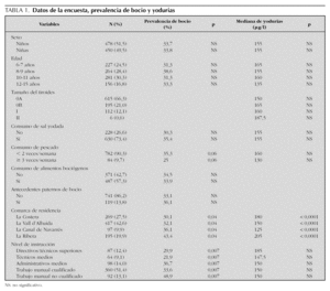 Se detectó bocio en 313 niños, lo que supone una prevalencia global del 33,7 % (IC 95 %: 30,7-36,9), principalmente a expensas de bocio no visible (21 %), sobre el visible (12,7 %). No se detectó ningún bocio grado III-IV.