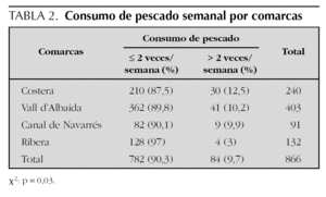 La descripción de las variables recogidas se muestra en la tabla 1. Hay que destacar que el 67,8 % de las familias tomaban sal yodada y que sólo un 9,7 % comían pescado más de dos veces a la semana con diferencias significativas según comarcas (p = 0,03), siendo más elevado en La Costera (> 2 veces a la semana en el 12,5 % de los niños), que en La Ribera donde sólo un 3 % toma pescado más de dos veces a la semana (tabla 2).
