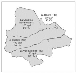 Figura 3. Distribución yodurias y bocio por comarcas.