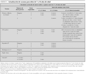 Resumimos en los anexos 1 y 2 los intervalos mínimos a respetar entre cada dosis para aquellos niños que están atrasados en sus inmunizaciones y los calendarios de actualización . El anexo 1 señala las recomendaciones entre los 7 y los 18 años de edad y el anexo 2 comprende el calendario para niños entre 4 meses y 6 años.