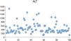 The mean levels identified in liver function tests were aspartate aminotransferase (AST), 208.72L (43–929); ALT, 471.8U/L (123–1488) (Fig. 3); ALP, 240.72U/L (63–402); gamma-glutamyl transpeptidase, 54.75U/L (10–220) and bilirubin, 1.04mg/dL (0.3–3.47).