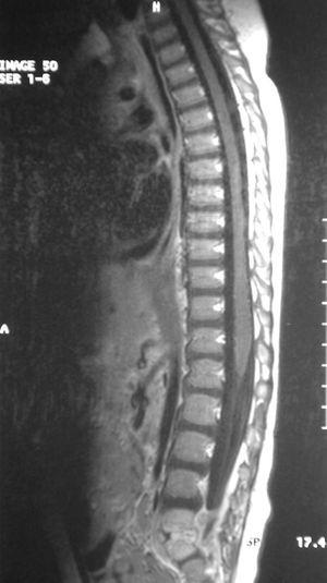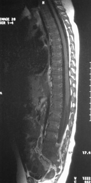 En la exploración no se observan adenopatías inguinales ni signos externos de traumatismo o inflamación articular. La palpación abdominal es normal y la movilización, activa y pasiva, de ambas caderas, rodillas y tobillos es completa aunque se observa una discreta hipotonía de los músculos abductores de la cadera izquierda en relación a la derecha. En la exploración neurológica destaca una disminución ipsolateral de los reflejos patelar y rotuliano. El llanto intenso al flexionar la espalda y la rectificación de la lordosis lumbar hicieron sospechar patología a dicho nivel.