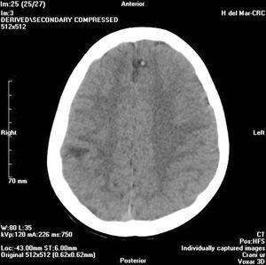 En urgencias se realiza analítica sanguínea (hemograma, bioquímica, ionograma, equilibrio ácido-base y coagulación) que resulta normal; y una TC craneal sin contraste en la que se observa una lesión nodular hipodensa de aspecto quístico con un elemento nodulillar mural sólido, de localización parietotemporal derecha con edema vasogénico asociado (fig. 1). Además se evidencian dos lesiones nodulares hipodensas, probablemente quísticas, con calcio puntiforme mural, localizadas a nivel frontal parasagital izquierdo y parietal derecho, sin edema asociado (fig. 2).
