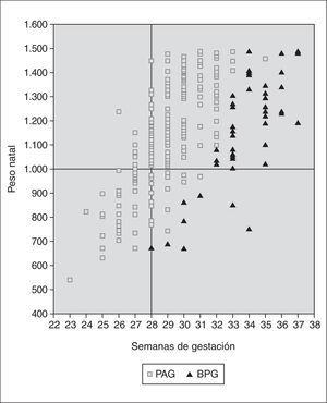La tabla 2 muestra los datos demográficos neonatales para los grupos PAG y BPG. Se aprecian diferencia en la edad gestacional, con una media de 29 (23-35) semanas para el grupo de PAG y de 33,5 (28-37) semanas para los de BPG. En la figura 1 se representan todos los niños en función del peso y gestación, apreciándose que los de BPG se sitúan en el cuadrante superior derecho, correspondiente a una mayor gestación. Destacamos que se diagnosticó un síndrome de dificultad respiratoria en casi el 40 % del grupo de PAG y sólo en el 4 % de los BPG.