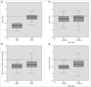 Evolución del peso. En la figura 2 y tabla 3 se aprecia que las diferencias del índice Z al nacer se igualan a los 2 años de edad posnatal corregida en ambos subgrupos. En comparación con la población general de nacidos a término, el peso a los 2 años de edad posnatal corregida se sitúa casi en 2 DE en los de BPG y de 1,34 DE en el de PAG. Entre los de BPG, en ningún caso el peso superó la media de la población general. A los 2 años de edad posnatal corregida, el 18,5 % de niños mantenía un peso inferior al tercer percentil (P3). El 36,9 % de niños de peso natal inferior a 1.000 g estaba por debajo del P3 a los 2 años frente al 12,3 % de los de mayor peso.