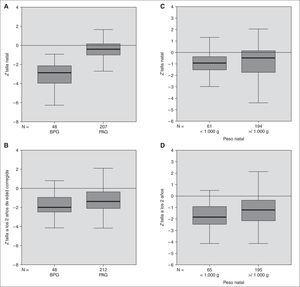 Figura 3. Índice Z de la talla (DE) en los subgrupos BPG y PAG al nacer (A)y a los 2 años de edad(B)y en los de peso inferior(C)o superior (D)a 1.000 g.