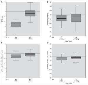 Figura 4. Índice Z del perímetro cefálico (DE) en los subgrupos BPG y PAG al nacer(A)y a los 2 años de edad(B)y en los de peso inferior (C)o superior (D)a 1.000 g.