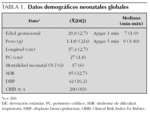 Durante el período de estudio fueron dados de alta de la unidad neonatal un total de 277, de los que 17 fallecieron después del alta (6,1 %), y fueron excluidos del estudio. La cohorte estudiada fue de 260 RNMBP (126 niñas y 134 niños). La tabla 1 refleja los principales datos neonatales de la población estudiada, cuya edad gestacional y peso natal medios (DE) fueron de 29,8 (2,67) semanas (valores extremos de 23-37 semanas) y de 1.149 (224) g (540-1.490), respectivamente. El 29 % procedían de gestaciones gemelares y el 5,7 % de múltiples. El 18,5 % del total fueron de BPG. La estancia media fue de 73 días, siendo de 66 en los BPG y de 74 días en los de PAG.