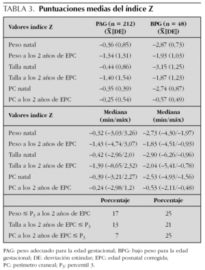 La media de peso al alta de toda la cohorte fue de 2.713 (809) g. El incremento diario de peso fue superior en los BPG (27,7 g) que en los de PAG (21,1 g). El aumento de peso de los < 1.000 g a los 2 años de edad posnatal corregida fue menor que en los de mayor peso natal. El crecimiento posnatal está represando en la tabla 3 con las puntuaciones medias del índice Z.