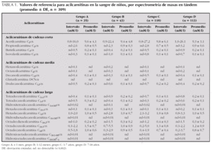 En conclusión, la espectrometría de masas en tándem es una técnica eficaz para la determinación de acilcarnitinas en muestras de sangre, de niños en diferentes grupos de edad. Es posible aportar valores de referencia como herramienta diagnóstica de las enfermedades hereditarias de la β-oxidación mitocondrial de los ácidos grasos.