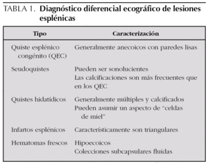 El diagnóstico diferencial de los quistes esplénicos incluye masas quísticas del cuadrante superior izquierdo del abdomen, que pueden tener orígenes variados: vías urinarias (quiste renal, displasia quística, hidronefrosis, duplicación obstruida, quiste de uraco), glándula suprarrenal izquierda (neoplasias), sistema gastrointestinal (quiste de duplicación, quiste del colédoco, atresia duodenal, seudoquiste pancreático, quiste mesentérico, quiste hepático), y en caso de quistes voluminosos, el origen puede estar en el sistema genital (quiste ovárico, neoplasia ovárica, hidrosalpingitis gigante) 1,7,10.