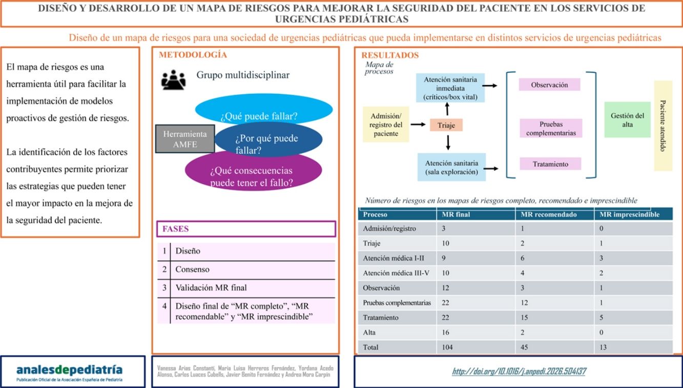 MetodologíaEstudio realizado entre noviembre de 2021 y mayo de 2023 en 4 fases: (1) Diseño: cuatro pediatras expertos en calidad y seguridad elaboraron un mapa inicial (definición de procesos, identificación de modos de fallos, efectos y factores contribuyentes). (2) Consenso: 41 consultores de 22 hospitales revisaron el mapa mediante metodología Delphi, obteniendo la versión final. (3) Validación del mapa final: se evaluaron frecuencia, gravedad y detectabilidad de cada modo de fallo (puntuación del 1-5). (4) Diseño final: se calculó el índice de prioridad de riesgo (IPR) y se definieron tres versiones: mapa de riesgos completo, mapa de riesgos recomendado (IPR>p50) y mapa de riesgos imprescindible (IPR>p90).