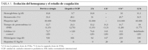 Figura 1. Evolución del volumen de la hemorragia por los drenajes torácicos y la necesidad de transfusión de hemoderivados con la administración de FVIIaR.