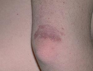 Varón de 14 años con síndrome de Down, sin otros antecedentes personales ni familiares de interés. Acudió a nuestra consulta por la aparición, desde hacía más de un año, de lesiones levemente pruriginosas en codo derecho que no habían cedido con la aplicación de corticoides y antifúngicos.