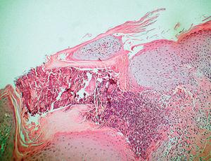Se realizó una biopsia cutánea, cuyo estudio histopatológico puso de manifiesto un canal transepidérmico en el que se observaban restos de células epiteliales necróticas con células inflamatorias y restos de fibras elásticas fragmentadas (fig. 2).