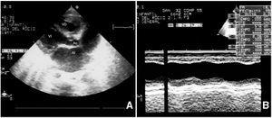 Figura 1. Dilatación de cavidades izquierdas (10 días de vida): A) Ecocardiografía 2D, proyección paraesternal de eje largo: enorme dilatación de la aurícula izquierda: relación AI/Ao 3.B) Ecocardiografía modo M del ventrículo izquierdo (10 días): dilatación del ventrículo izquierdo con importante afectación de su contractilidad; AF: 18,5; FE: 35,5 %.