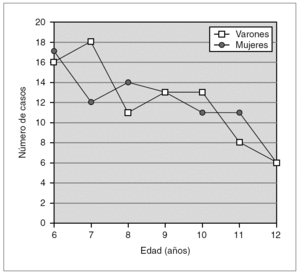 La edad media de la muestra (n = 169) en el momento del diagnóstico era de 8,8 años (IC 95 %: 8,7-9,0). En la figura 1 se expone la distribución de las edades y sexo en el momento del diagnóstico, objetivándose una prevalencia inversamente relacionada con la edad de diagnóstico. El tiempo medio de seguimiento evolutivo de estos pacientes ha sido de 3,5 años (IC 95 %: 3,28-3,87). La etiología de la epilepsia fue considerada como idiopática en 102 casos (60,4 %), criptogénica en 36 (21,3 %) y sintomática en 31 (18,3 %).