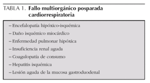 En una PCR se produce una situación de hipoxia e isquemia que afecta a todos los órganos, los más importantes están recogidos en la tabla 1. La intensidad del daño depende de la duración de la parada, de la eficacia de la reanimación, y del tiempo que se tarde en conseguir una circulación espontánea adecuada. El objetivo del tratamiento posresucitación es mantener al organismo en las mejores condiciones para evitar que aparezcan lesiones orgánicas secundarias que aumenten la mortalidad y las secuelas 1-3.