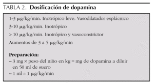 La dopamina tiene efectos diferentes según la dosis utilizada (tabla 2). En la estabilización posresucitación se suele iniciar a dosis de 5 μg/kg/min y se aumenta de 3 a 5 μg/kg/min hasta conseguir normalizar la PA.