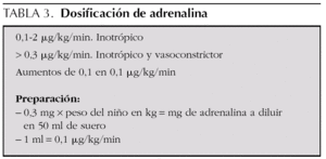 Preparación y administración: ambos fármacos deben ser administrados en perfusión continua mediante una bomba de infusión volumétrica. Se pueden diluir en sueros glucosados o salinos, pero no en soluciones alcalinas. Existen muchas fórmulas para calcular la preparación de la dilución. Lo importante en situaciones de emergencia es familiarizarse con una fórmula para evitar errores en la preparación y el manejo. Las tablas 2 y 3 recogen las fórmulas recomendadas para bombas de jeringa de 50 ml (si se usan sueros de 100 ml sólo hay que multiplicar la dosis por 2 y en sueros de 500 ml por 10). Estas preparaciones tienen la ventaja de su fácil memorización, y sencillez de preparación y uso, ya que 1 ml/h corresponde a 1 μg/kg/min de dopamina y 0,1 μg/kg/min de adrenalina y no hay que hacer cálculos adicionales para aumentar o disminuir la dosis. Su desventaja es el alto volumen de líquido administrado en lactantes (dopamina a 10 μg/ kg/min = 10 ml/h = 240 ml/día supone la mitad de las necesidades de líquidos para un niño de 4,8 kg) por lo que deben usarse sólo para la estabilización inmediata y el transporte.