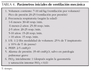 La ventilación puede ser manual o mecánica, si existe un respirador adecuado para la edad del paciente. No se deben utilizar los respiradores de adulto para lactantes y niños pequeños, ya que existe un elevado riesgo de hipoventilación e hiperventilación y barotrauma. Los parámetros iniciales de ventilación mecánica en el niño fuera del período neonatal están resumidos en la tabla 4. El inicio de la ventilación mecánica no indica que pueda disminuirse la vigilancia y monitorización del paciente. Tras 10-20 min de ventilación mecánica debe realizarse una nueva gasometría, para ajustar los parámetros del respirador.