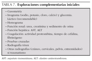 6.º Extracción de analítica: las exploraciones iniciales ayudan a valorar la repercusión de la PCR sobre distintos órganos y sistemas (función renal y hepática), indican la eficacia de la ventilación (gasometría), pueden orientar sobre las causas de la parada, y servirán para diagnosticar alteraciones metabólicas (acidosis grave, hiperpotasemia, hipoglucemia, etc.), hematológicas (anemia, coagulopatía), respiratorias (neumotórax, hemotórax, desplazamiento del tubo endotraqueal) que requieren tratamiento inmediato. Las exploraciones complementarias iniciales vienen recogidas en la tabla 7.