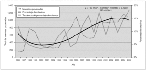Figura 1. Porcentaje de resultados positivos a rotavirus, línea de tendencia del porcentaje de rotavirus y número total de muestras procesadas (1986-2005).