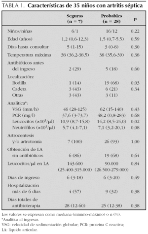 Aunque el diagnóstico de artritis séptica depende de la sospecha clínica, sólo es definitivo cuando existe crecimiento bacteriano. En estudios recientes el germen se identificó entre el 29 y el 52 % de los casos6-8. Nuestro rendimiento bacteriológico fue bajo (12 %) lo que se puede atribuir a diversos factores: a) antibioterapia previa en 7 pacientes (20 %) y en cuatro de los líquidos cultivados (14 %); b) no recogida de muestras en seis (17 %); c) las técnicas de cultivo, o d) un diagnóstico erróneo. En relación con los métodos de cultivo, el servicio de microbiología trabaja con protocolos normalizados. La posibilidad del error diagnóstico no puede ser rechazada de forma absoluta, a pesar de que se excluyeron específicamente artritis crónicas inflamatorias e infecciosas, osteomielitis que no empezaron como artritis, infecciones esqueléticas axiales, artritis virales y reactivas, sinovitis sin aumento de reactantes de fase aguda9, celulitis y bursitis, así como la enfermedad de Perthes, la epifisiólisis y otros procesos ortopédicos. También fueron excluidas las artritis sépticas que consultaron después de 15 días del inicio de los síntomas o aquellas en que el paciente presentaba una enfermedad de base, por juzgarlas potencialmente más complejas.