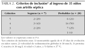 En este estudio las osteoartritis se clasificaron como artritis sépticas seguras. Caksen et al12 no encontraron diferencias entre artritis sépticas con o sin osteomielitis, a pesar de que en la literatura médica con frecuencia se señala el peor pronóstico de las artritis asociadas a osteomielitis13.