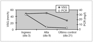 Figura 2. Velocidad de sedimentación globular (VSG) y proteína C reactiva (PCR) a los 3, 9 y 21 días de mediana desde el comienzo de los síntomas.