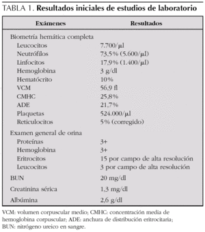 Presentamos el caso de una paciente del sexo femenino de 12 años de edad que acude a la clínica ambulatoria con la queja principal de exoftalmos (proptosis) unilateral de 6 años de evolución y palidez. La paciente se encontraba aparentemente sana hasta los 6 años de edad, cuando su madre observa aumento del tamaño del ojo izquierdo, palidez y fatiga sin ningún otro síntoma acompañante. En aquel momento fue atendida en un hospital de su localidad en donde se realizó una tomografía computarizada de órbita; en ésta se comunicó una masa retroorbitaria que producía la proptosis del ojo izquierdo de la cual se tomó biopsia revelando un proceso crónico inflamatorio inespecífico. Se inició tratamiento con prednisona oral a 2 mg/kg/día, con leve disminución del exoftalmos. A la vez se detectó anemia microcítica hipocrómica cuya causa no fue dilucidada ya que la paciente no acudió a sus citas de seguimiento. Durante los siguientes 6 años fue controlada con varios médicos privados y "curanderos" de su localidad sin obtener mejoría, mientras la proptosis volvía a hacerse aparente. Al llegar a nuestra clínica se apreciaba una clara proyección del ojo izquierdo y palidez. A la auscultación se notó un soplo medio sistólico grado II sobre VI. No presentaba linfadenomegalia, esplenomegalia o algún otro órgano involucrado. Sus signos vitales eran normales, a excepción de una leve taquicardia. En ese momento se realizan los primeros estudios de laboratorio (tabla 1). Como se puede apreciar, con los resultados obtenidos, se agregó proteinuria, hematuria, anemia (regenerativa, hipocrómica, microcítica) y linfopenia a nuestro listado de problemas. Las pruebas de función tiroidea y la electroforesis de hemoglobina se reportaron normales. La paciente se hospitalizó y se obtuvo un aclaramiento de creatinina en 24 h de 36 ml/min/1,73 m 2 (valores normales: 88 a 137). Los anticuerpos antinucleares (ANA) con patrón moteado fueron positivos 1:40 (inmunofluorescencia indirecta en células Hep-2). Los anticuerpos anti-ADN de doble cadena, anti-SSA, anti-SSB, anti-RNP y anticuerpo Smith fueron negativos. Se reinició prednisona oral a 2 mg/kg/día. La resonancia magnética (RM) nuevamente reveló la presencia de la masa retroorbitaria pero en esta ocasión y por su tamaño menor no se consideró prudente realizar otra biopsia. Después de estabilizar a la paciente con transfusión sanguínea se realizó biopsia renal guiada por ultrasonido. En la microscopia óptica e inmunofluorescencia se observaron depósitos de complejos inmunes de IgG, IgA, IgM, C3 y C4 en el mesangio y vasos capilares, clasificando estos hallazgos como una glomerulonefritis difusa proliferativa clase IV de acuerdo a la clasificación de nefritis lúpica de la Organización Mundial de la Salud. Se inició tratamiento inmunosupresor a base de hidroxicloroquina oral 200 mg/día y prednisona a la dosis antes mencionada. Un mes después presenta una crisis convulsiva tónico-clónica generalizada por lo que se inició tratamiento con fenobarbital, el cual fue sustituido posteriormente por difenilhidantoína; en ese momento una RM de cerebro demostró áreas hiperintensas en lóbulo frontal, parietal y temporal, compatibles con vasculitis. Un mes después no se presentaron más complicaciones o secuelas y su curso ha sido hacia la mejoría agregándose ciclofosfamida intravenosa 500 mg cada 2 meses. La proteinuria y la hematuria han desaparecido hasta el momento.