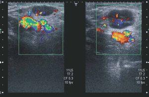 Niña sana de 6 años con tumefacción dolorosa inguinal izquierda de 3 días de evolución y febrícula. Presenta 2 tumoraciones inguinales muy dolorosas y calientes. El resto de la exploración así como el estudio analítico es normal. En la ecografía inguinal se observan: adenopatías de tamaño significativo, muy hipoecogénicas y muy vascularizadas (hipervascularización de carácter central), dos de gran tamaño localizadas en tejido celular subcutáneo, adyacentes y anteriores a los vasos femorales comunes y al cayado de vena safena mayor (fig. 1). Con el diagnóstico de adenopatía inguinal izquierda reactiva a forúnculo en rodilla izquierda, se inicia tratamiento con amoxicilina-ácido clavulánico intravenosa 100 mg/kg/día. A los 5 días aunque la fiebre ha desaparecido, las adenopatías inguinales han aumentado de tamaño y se constata salida de material purulento por la pápula de la rodilla izquierda.