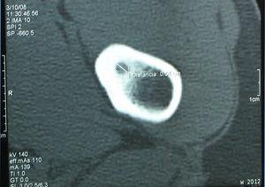 Se solicitaron radiografías de rodilla y pelvis. Las primeras fueron normales, pero en la metáfisis femoral, cercana a la cadera izquierda, se evidenciaba una osteopenia regional y una lesión con marcada esclerosis cortical y nidus central, compatibles con un osteoma osteoide (figura 1). El estudio con tomografía computarizada (TC) confirmó la presencia de un nidus de 5,4mm (figura 2). Se solicitó una consulta con el Servicio de Traumatología de nuestro hospital, que realizó una resección del nidus. El estudio anatomopatológico confirmó el diagnóstico. Cuatro meses tras la intervención, el paciente está asintomático y la movilidad de ambas caderas es normal, aunque persiste una discreta atrofia en el muslo izquierdo, con un perímetro 2cm menor.