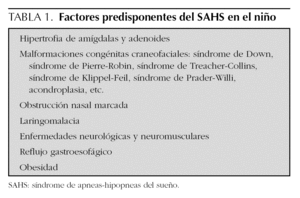Antecedentes personales. A diferencia del adulto, el sexo no es un factor de riesgo. En la anamnesis deberá recogerse la existencia de hipertrofia adenoamigdalar y de otros factores de riesgo o predisponentes para el desarrollo de SAHS en la infancia (tabla 1).