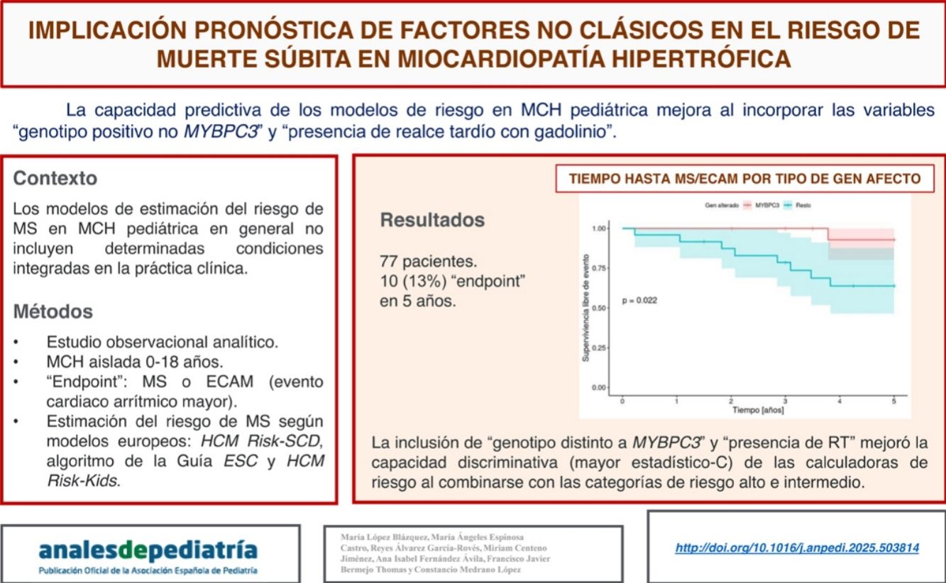 La miocardiopatía hipertrófica (MCH) es la miocardiopatía familiar más frecuente globalmente y la segunda más prevalente en edad pediátrica1. Se debe en su mayoría a variantes causales en genes sarcoméricos (40-60%), siendo MYBPC3 y MYH7 los más frecuentes2,3. La muerte súbita (MS) es la primera causa de exitus durante la niñez y adolescencia (incidencia 0,8-2% anual), más frecuente en MCH aislada que en el contexto de otro síndrome/enfermedad4–6.