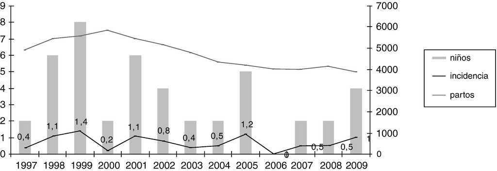 ResultadosSe incluyó en el estudio a 46 niños, con una incidencia de 0,7 casos por 1.000 recién nacidos vivos, que varió a lo largo de los años del estudio, entre 0,2/1.000 y 1,4/1.000. (Figura 1).